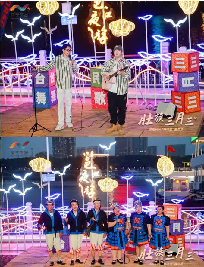 三月三期間,民生旅游碼頭邕江夜游項(xiàng)目推出穿民族服飾免費(fèi)乘坐特定航班、躉船民族服飾試裝區(qū)、演奏非遺獨(dú)弦琴、滑板+陸沖極限運(yùn)動(dòng)賽、潮流音樂精良打酒站、少兒鴻鵠樂坊快閃等精彩活動(dòng),讓市民和游客們在這個(gè)廣西特有的節(jié)日里感受到了濃厚的民族文化氛圍和節(jié)日的歡樂,成為了市民和游客們歡度佳節(jié)的熱門選擇,留下了美好的回憶。