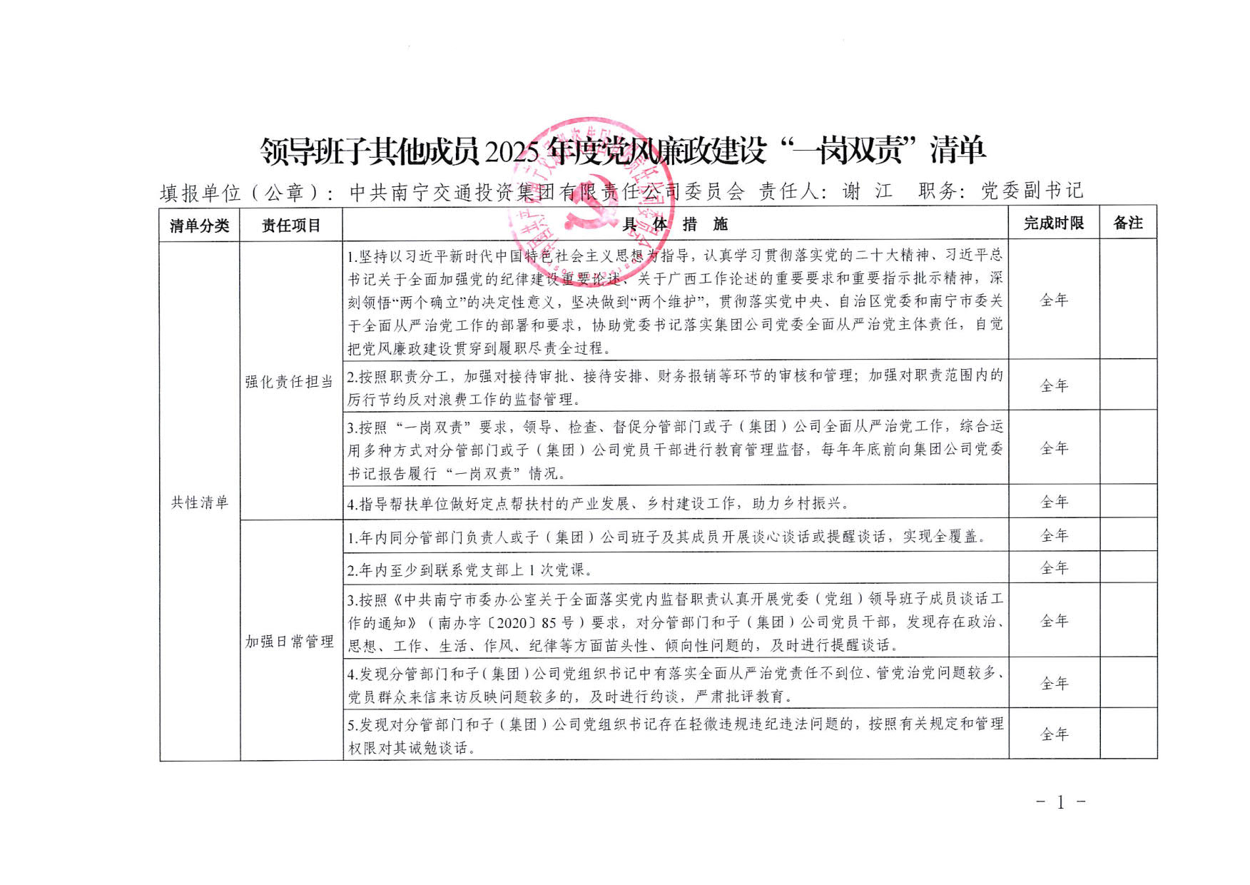 南寧交投集團(tuán)領(lǐng)導(dǎo)班子其他成員2025年度黨風(fēng)廉政建設(shè)“一崗雙責(zé)”清單(一)