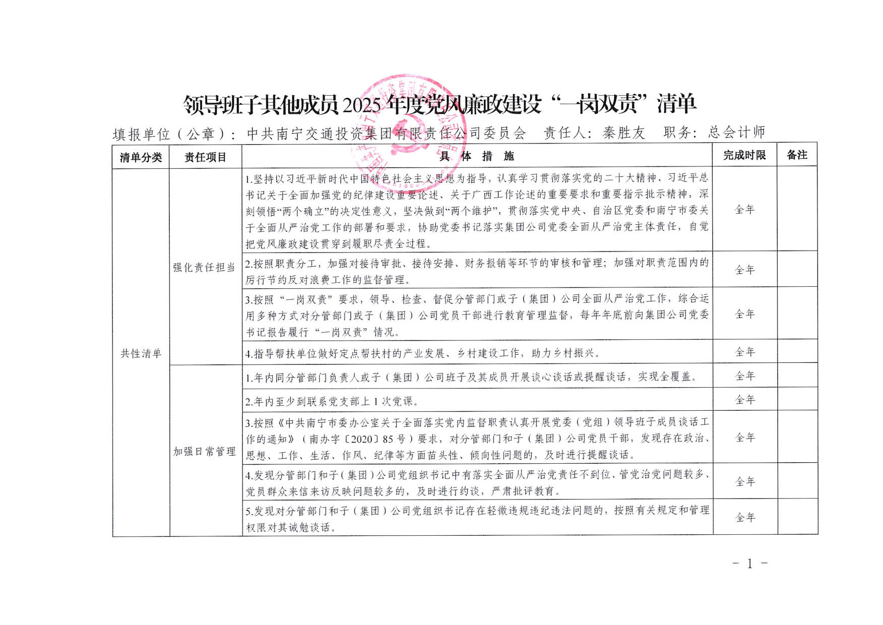 南寧交投集團領導班子其他成員2025年度黨風廉政建設“一崗雙責”清單(七)