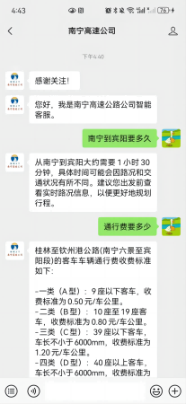 司乘只需關(guān)注“南寧高速公司”微信公眾號,點擊發(fā)消息即可輕松開啟在線咨詢之旅。這種將AI智能客服融入微信公眾號的方式,充分考慮了司乘人員的使用習(xí)慣,進(jìn)一步拉近了企業(yè)與司乘之間的距離。