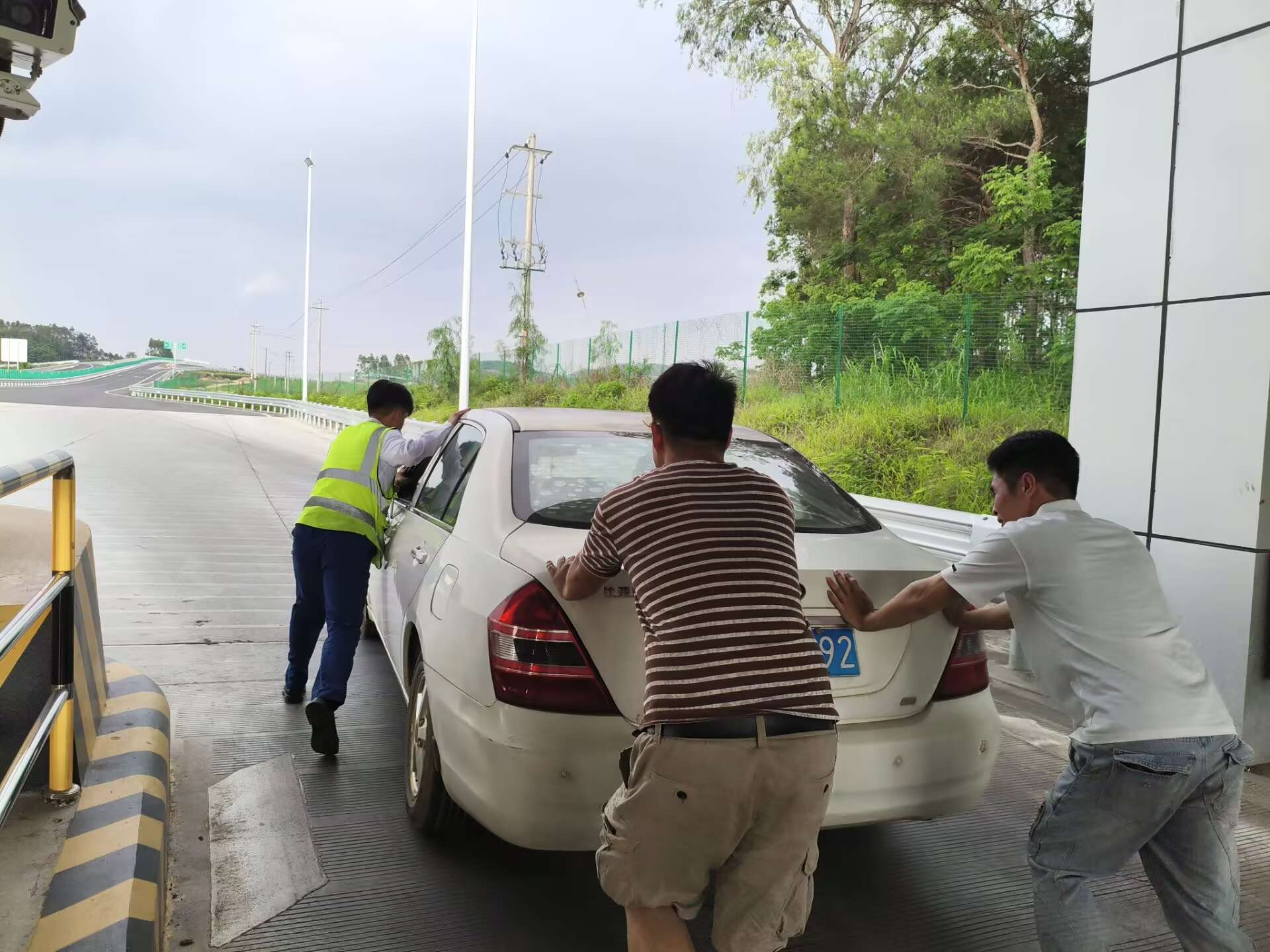 6月14日15時許,在林橫高速洋橋收費站,一輛小轎車在下高速時因發(fā)動機故障滯留在車道中并伴有白煙冒出,因事發(fā)時正逢暴雨,情況險急。當(dāng)班收費員周秋吉、吳星煒察覺異常后第一時間上報監(jiān)控中心并開啟備用車道,迅速引導(dǎo)后方車流安全有序轉(zhuǎn)移,同時取用滅火器隨時準(zhǔn)備應(yīng)對突發(fā)情況。在確認(rèn)車輛無法啟動且白煙仍在持續(xù)冒出時,收費員冒雨協(xié)同司乘將車輛推離車道,轉(zhuǎn)移至收費站外廣場安全地帶停放,并幫助司乘聯(lián)系拖車,暖心服務(wù)讓司乘連連“點贊”。