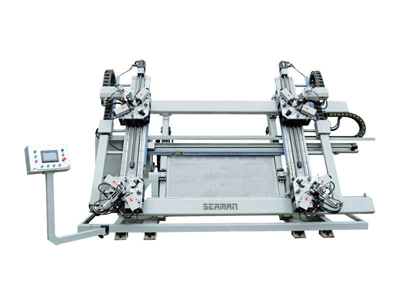 ●四機頭均設(shè)有可伸縮大行程輔助外定位裝置,方便可靠的進行扇料組角;